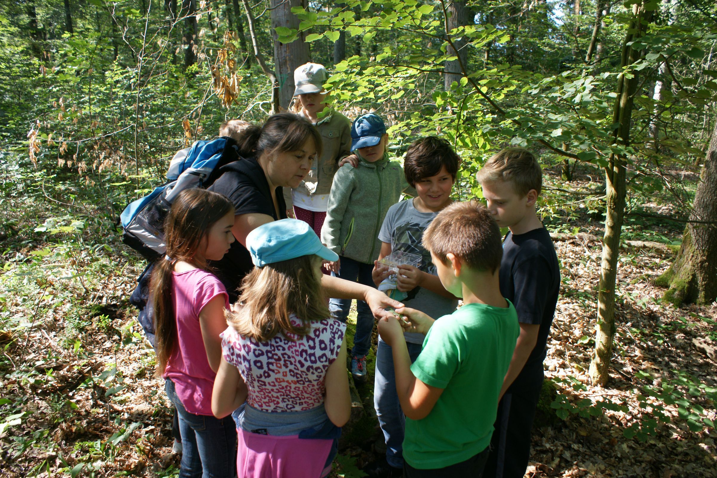 »Der Wald hat tausend Augen« lautete der Titel unseres Ferienprogrammes. Dass BNE (Bildung für nachhaltige Entwicklung ) so richtig Spaß machen kann, erlebten die Kinder während des dreieinhalbstündigen Aufenthaltes im Wald. Zuerst wurde unter vollem Einsatz ein riesiges Storchennest gebaut. Die »Zentrale«, in der alle ausreichend Platz hatten, um alles über die Lebensweise des Schwarzstorches zu erfahren. Die Frage, was andere waldbewohnende Vögel zum Leben brauchen, führte die Gruppe zu einem Totholzstamm. Entdecken macht ja so viel Spaß! Interessant, welch unterschiedliche Insekten oder Pilze dort zu finden sind! Die Kinder erkannten schnell, wie wichtig solche Strukturen für den Wald sind.