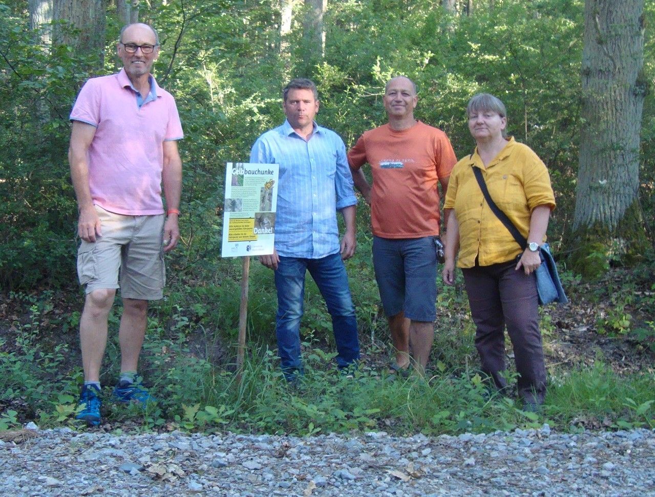 Nachdem mit dem Schottern von Waldwegen immer mehr Laichgewässer der Gelbbauchunken verschwinden, hat sich die Gruppe heuer um die Schaffung von neuen »Pfützen« bemüht. In Absprache mit der Gemeinde Markt Bibart und der Waldgenossenschaft dort wurde am Wegrand und in Wegseitengräben versucht, dauerhafte Tümpelchen anzulegen. Leider war der Boden durch den trockenen Sommer und Winter 2018 noch so fest, dass es keine dauerhafte Verdichtung gab. Hier muss noch nachgearbeitet werden. Die Pfützen müssten das Wasser während der Entwicklungszeit von der Eiablage, über das Kaulquappenstadium bis zur Verwandlung in das fertige Amphib halten. Damit diese Fahrspuren und Tümpelchen nicht aus Versehen befahren oder zerstört werden, wurde ein Schild mit Informationen zur Gelbbauchunke gestaltet und an den entsprechenden Stellen angebracht.